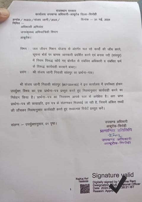 आबूरोड। जल जीवन मिशन योजना अंतर्गत करवायें गये कार्यों कि जांच हेतु प्रस्तुत परिवाद पर उपखंड अधिकारी आबूरोड द्वारा संबंधित विभाग के अधिषाशी अभियंता जन स्वा अभियांत्रिकी विभाग आबुरोड को ही स्वयं कि व विभाग के अधिकारियों के विरुद्ध जांच सौंपी दी जो सवालों के घेरे में है लगता है जीरो टॉलरेंस नीति के नक्शे कदम पर चलने कि कहानी आधी अधुरी रह गई राजस्थान में भाजपा कि सरकार बनते ही आम जन मे एक आश जगी कि अब किसी भी विभाग में बैठे अधिकारियों द्वारा अपने पद के विपरित आचरण करने पर कार्यवाही होगी व निष्पक्ष जांच हो कर दोषियों को बख्शा नहीं जाएगा पर यह एक छलावा साबित हो रहा है।